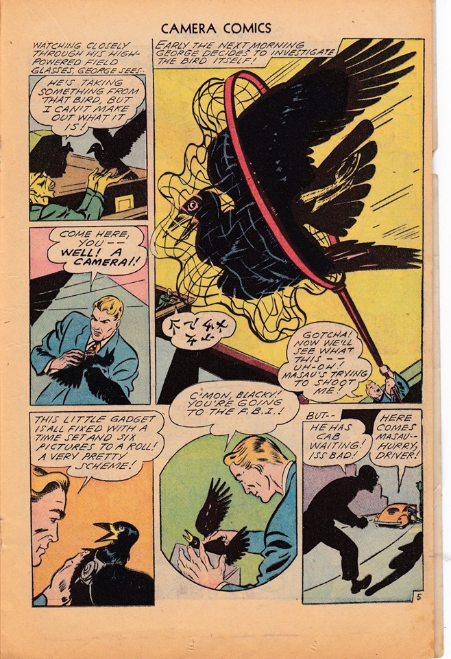 "Watching closely through his high-powered field glass George sees…", page from Camera Comics No. 1
