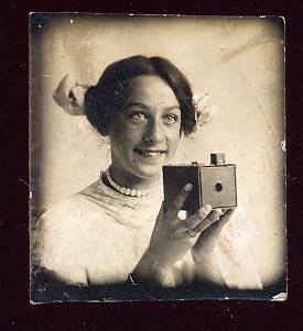 Portrait of a smiling young woman with a No. 1 Brownie camera