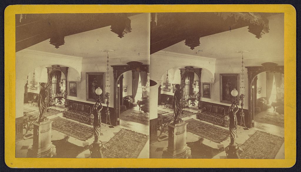 Stereograph showing statues, lamps, rugs, and other furniture as seen from above and through archways.