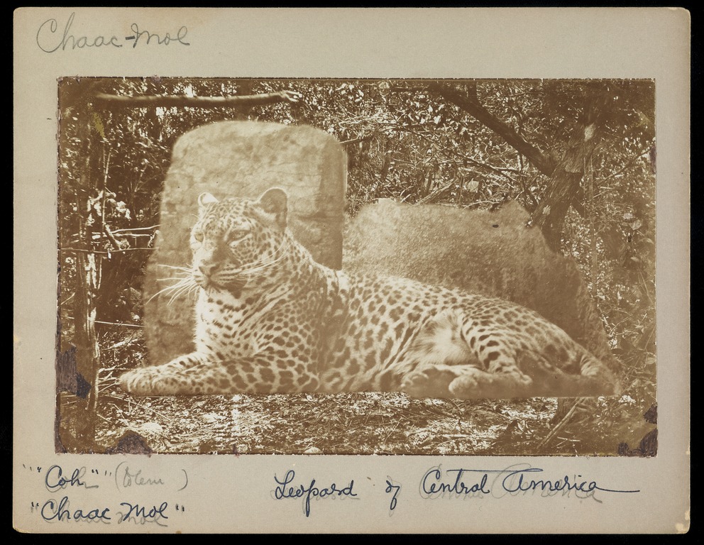 In this composite photograph an image of a lion, probably taken in a zoo, has been placed in a jungle setting. The image was used as Plate LXXII in Queen Moo. Leopard of Central America. 'Coh' (totem) 'Chaac Mol'--written on recto of mount. For another print of this image see accession number 2004.m.18-b11.25; for a lantern slide illustration of this image see 2004.m.18-b31.13.