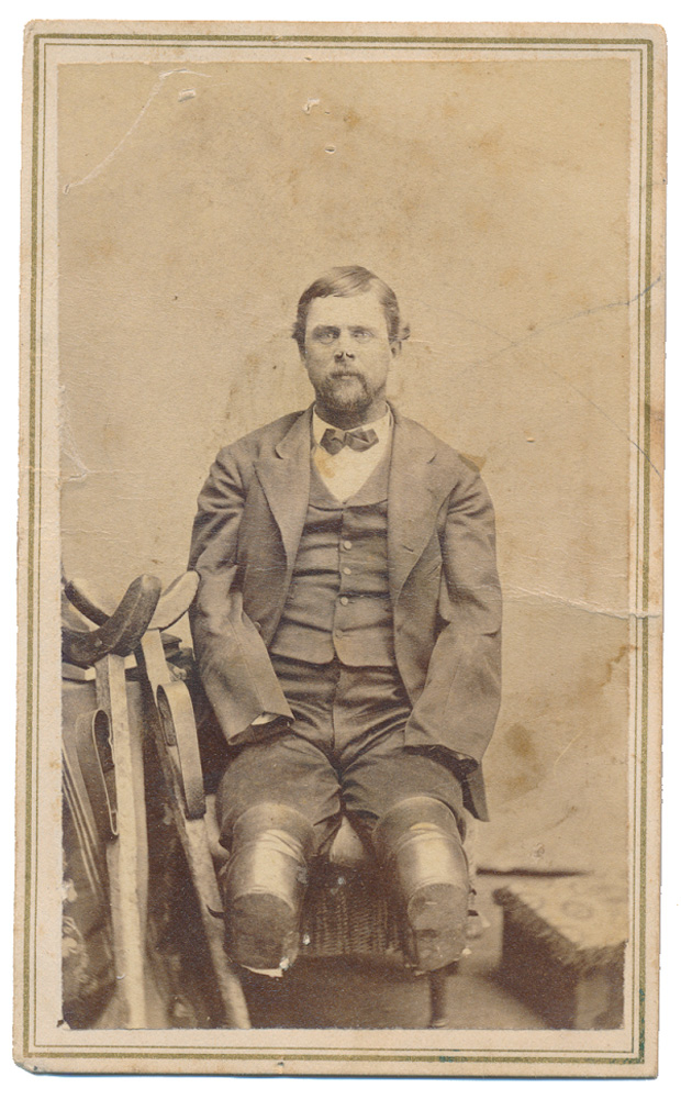 On back: Benjamin Franklin, The Unfortunate Soldier, who lost all his limbs by freezing, while crossing the plains from Fort Wadsworth, Dacotah Territory, to Fort Ridgely, Minn. While he was making the journey, in company with four others, they were caught in one of those dreadful storms which frequently occur on the plains, and all of his comrades perished. He was out eight days and seven nights without food or fire, and when found by two Indians was nearly starved to death. He is now trying to sell his Photographs for the benefit of his family which consists of a wife and three children. Price 25 Cents.