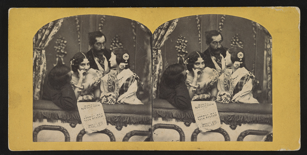 Photograph shows two couples at the theater. A Playbill with text "Laura Keene, New Theater, Our American Cousin, Seventh Week, New Comedy" hangs over the side of their box seating. Image may depict actress Laura Keene whose show opened in New York City, October 1858.