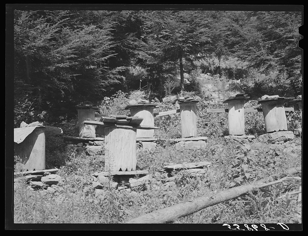 Beehives made of hollowed-out logs at farm on Stinking Creek on Pine Mountain, Kentucky