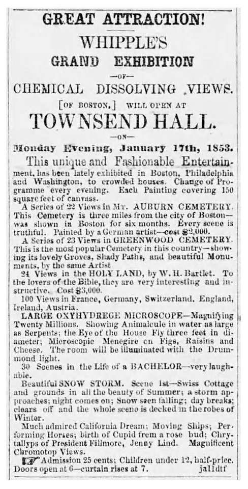 Great Attraction! Whipple's Grand Exhibition of Chemical Dissolving Views. [of Boston,] will open at Tonsend Hall