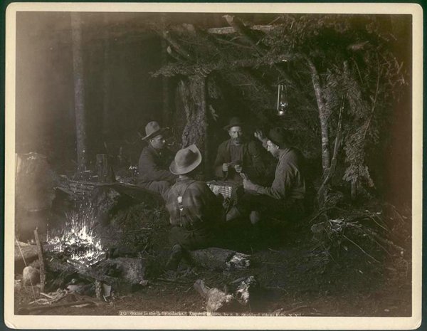 Men play cards by firelight in front of a lean-to. The illustration in Adler "Early Days in the Adirondacks", p. 54, is lighter, and the fire itself is different, showing more of an overall glow rather than the clear sparking in this view. This reveals Stoddard's experimental approach to rendering the effect of the lighting.