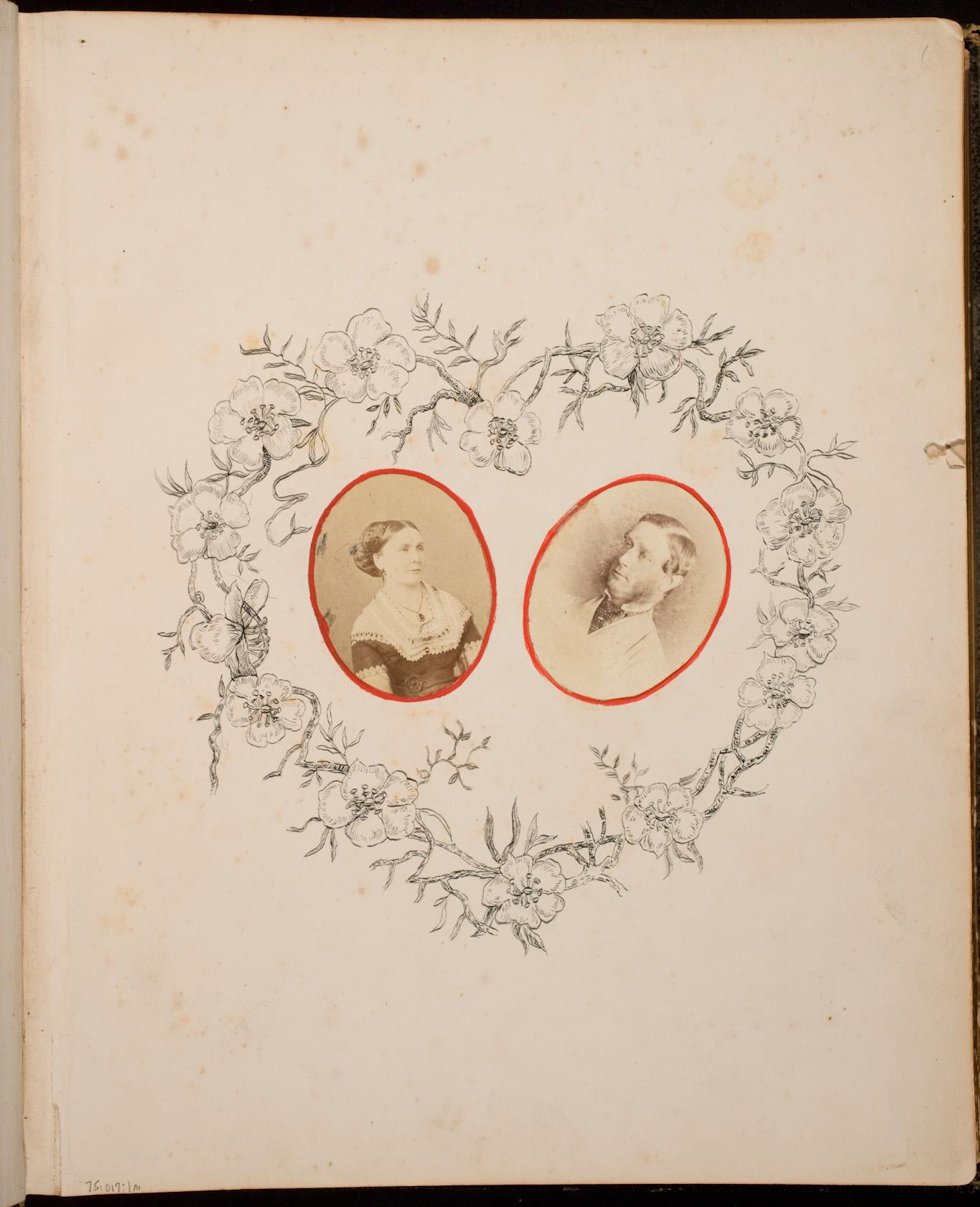 Man and woman framed by heart-shaped floral design