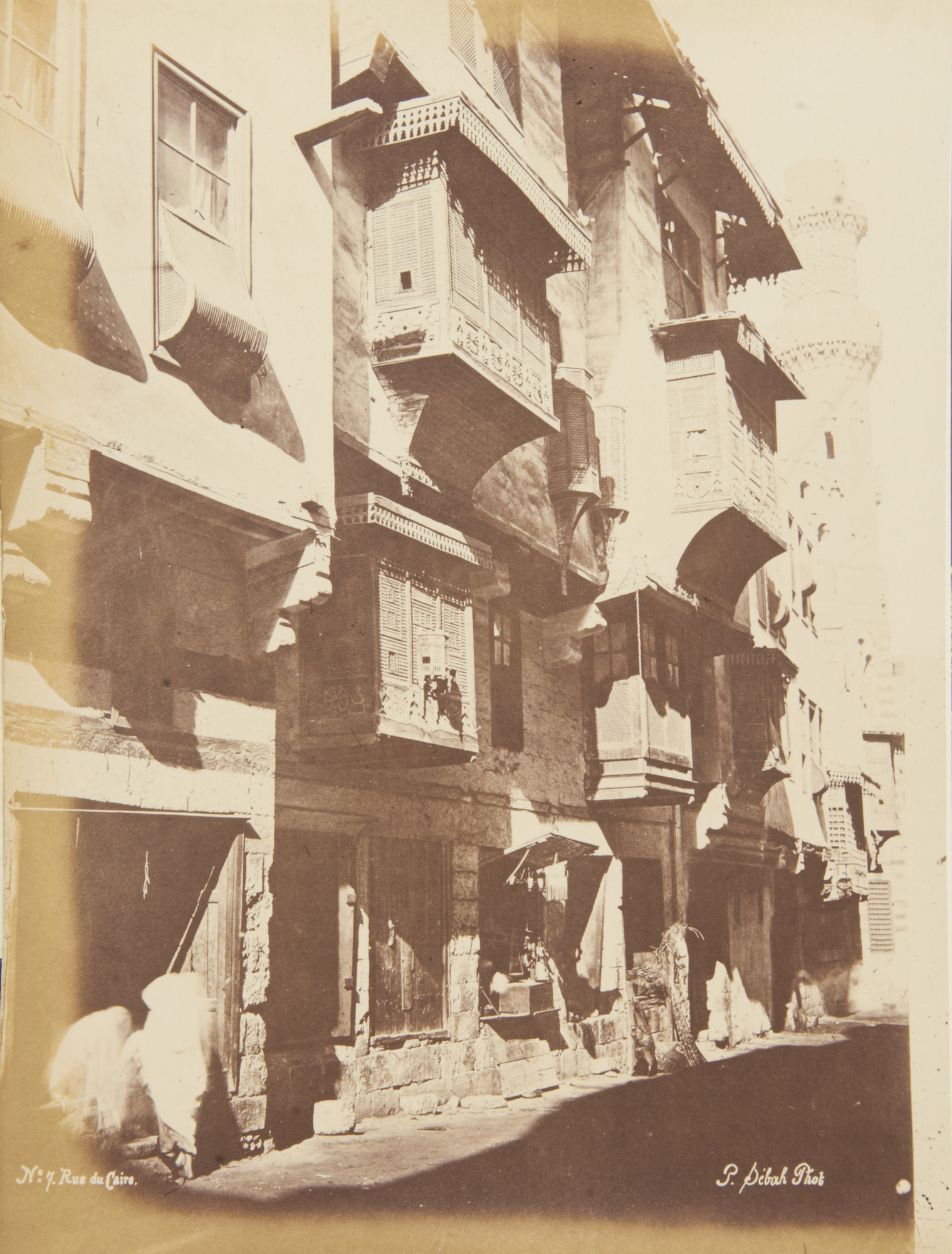 Photograph of street scene in Cairo: buildings of three and four stories with balconies and shuttered windows, minaret in background