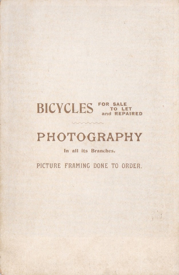 Backmark for "Bicycles For Sale To Let and Repaired - Photography In all its Branches - Picture Framing Done To Order." [Lagacy (Pascoag, R.I.)]