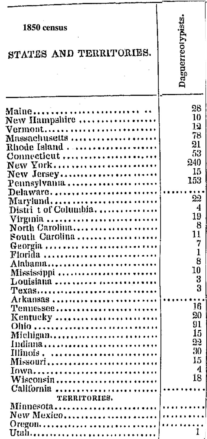 Numbers of 15-year-and-older male Daguerreotypists in US States and Territories (1850 census)