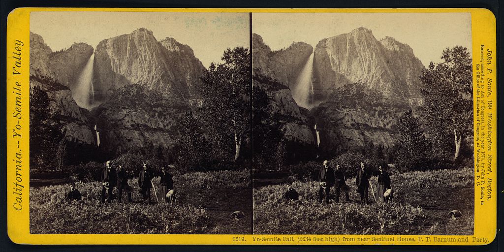 Yo-Semite Fall, (2634 feet high) from near Sentinel House, P.T. Barnum and party