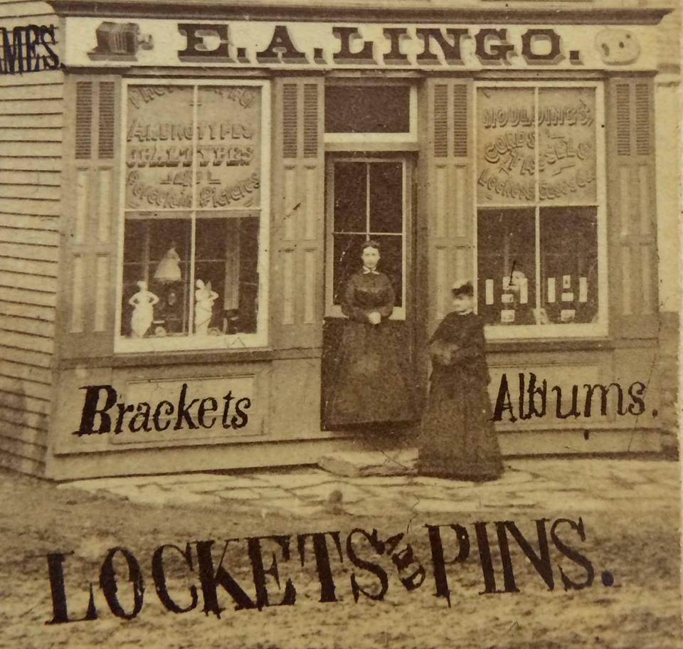 Windows are painted "Photographs, Ambrotypes, Opaltypes, and Porcelain Pictures" and "Mouldings, Cords, Tassles, Lockets and Cases."