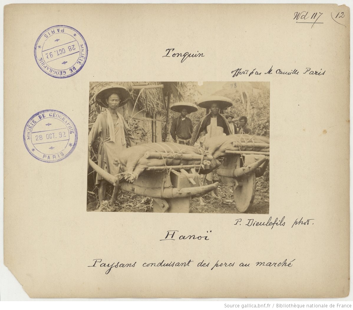 Tonquin, Hanoï, paysans conduisant des porcs au marché