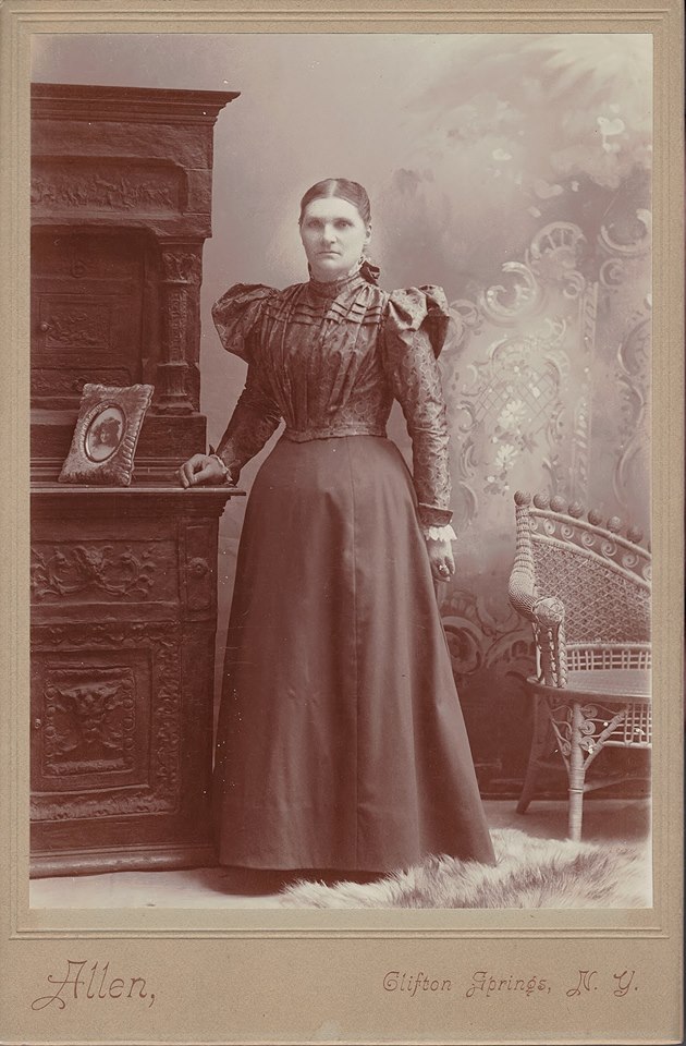 Studio portrait of a woman standing on a fur rug with a wicker posing chair, dresser and painted background