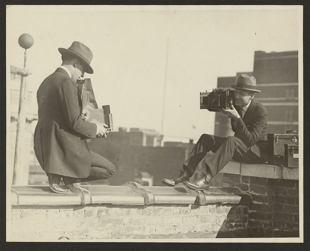 Two photographers taking each other's picture with hand-held cameras while perched on a roof