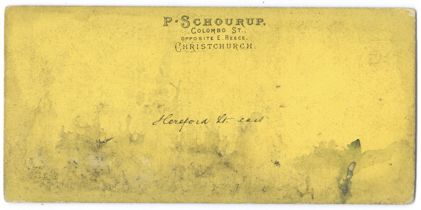 Backmark for "P. Schourup, Colombo St., Opposite E. Reece, Christchurch."