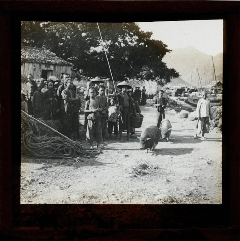 A group of onlookers and two pigs, China