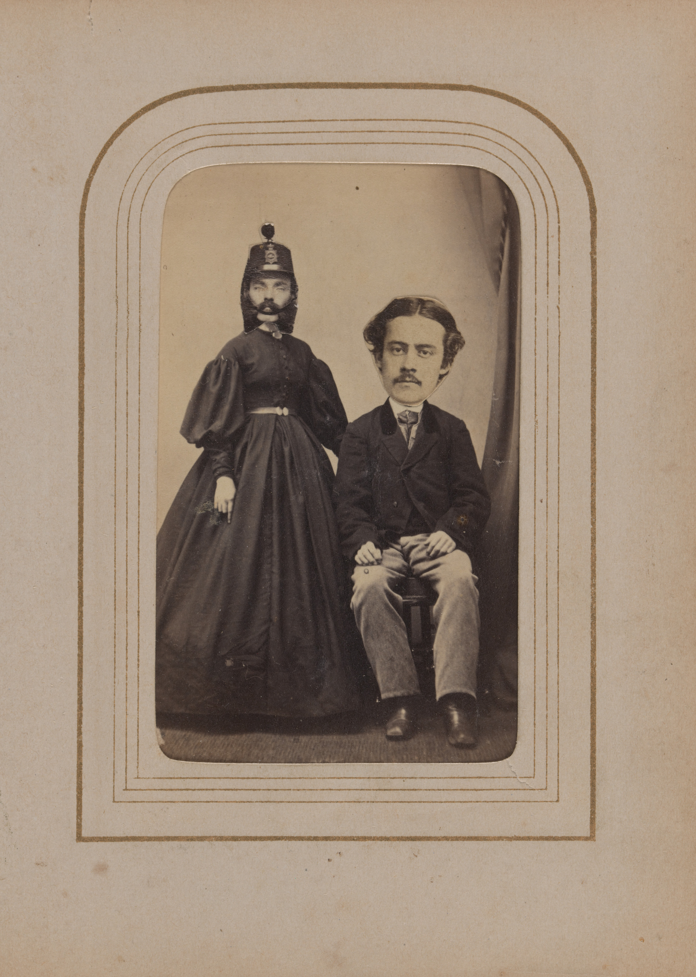 Beginning in the late 1850s, cartes de visite, or small photographic portrait cards, were produced on a scale that put photography in the hands of the masses. Ahead of its time, this unusual collection of collages spoofs the rigidity of the format. The images play with scale and gender by juxtaposing cutout heads and mismatched sitters, thereby highlighting the difference between social identity—which was communicated in part through the exchange of calling cards—and individuality.