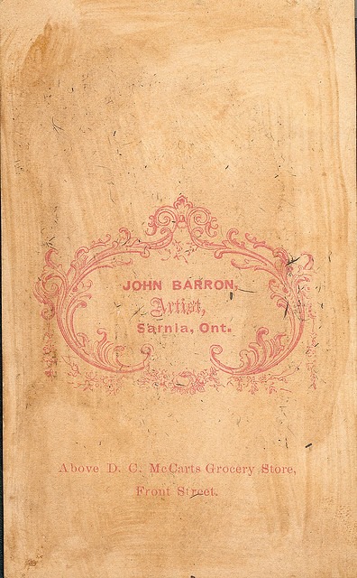 Wet stamp for "J. Barron, Artist, Sarnia, Ont." - "Above D. C. McCarts Grocery Store, Front Street."