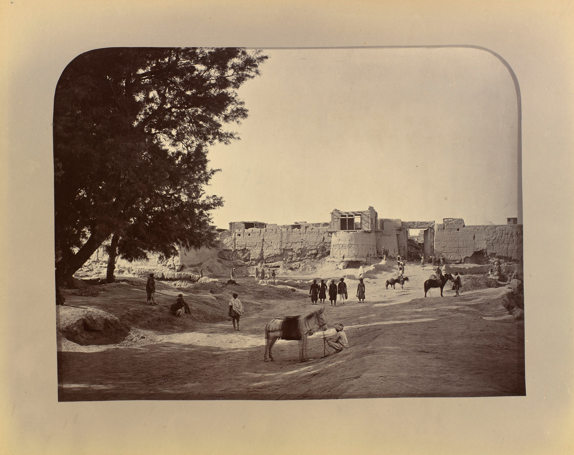 Photograph of the Peshawar Gate at Jalalabad. In the foreground there is a road with a large tree to the left. An Afghan man is sitting on the road beside a donkey and people and animals are gathered in small groups behind him. Behind are the rough stone exterior walls of the town, with an open gate to the right. The photographer John Burke travelled with the Peshawar Valley Field Force during the Second Anglo-Afghan War (1878-80), one of a series of conflicts between Britain and Russia over control of Afghanistan. His images from the war capture landscapes, key strategic sites and people involved in the conflict.