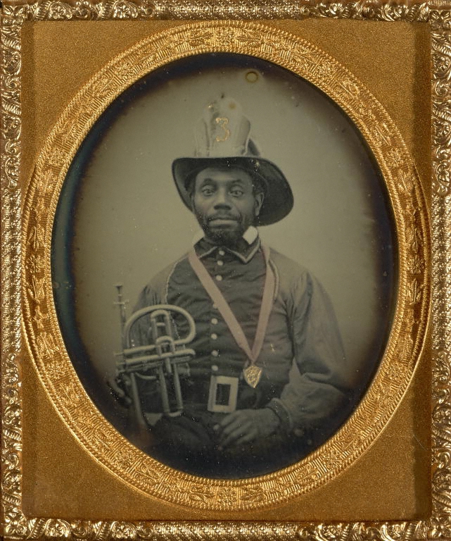 [Fireman in Uniform Holding a Brass Musical Instrument]