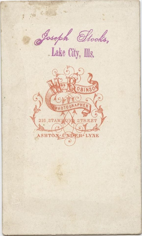 Backmark for "Mrs. Robinson, 216 Stamford Street, Ashton-Under-Lyne" stamped with "Joseph Stooks, Lake City, Ills," in purple