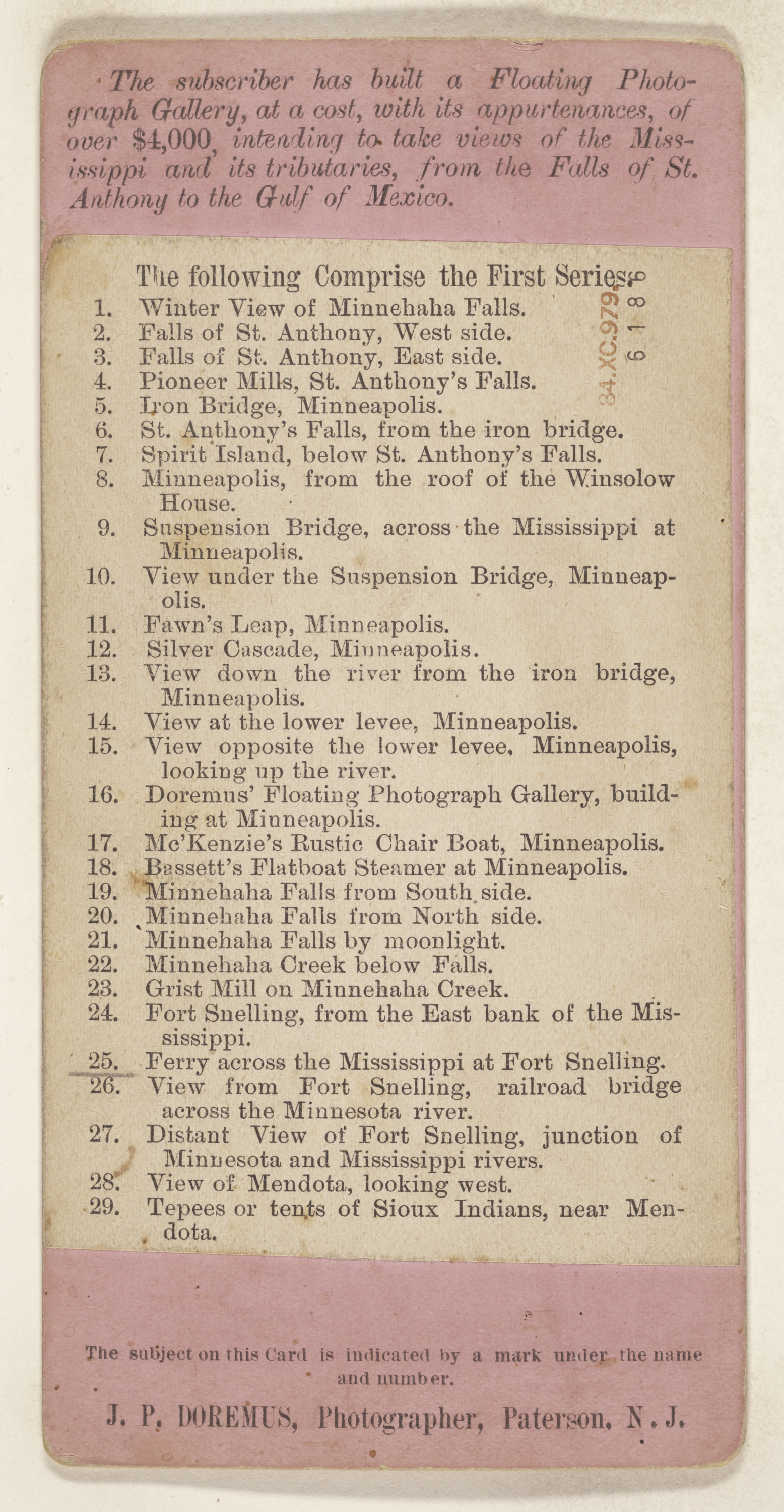 Backlist for "J. P. Doremus, Photographer, Paterson, N. J." - "The following Comprise the First Series" [1-29]