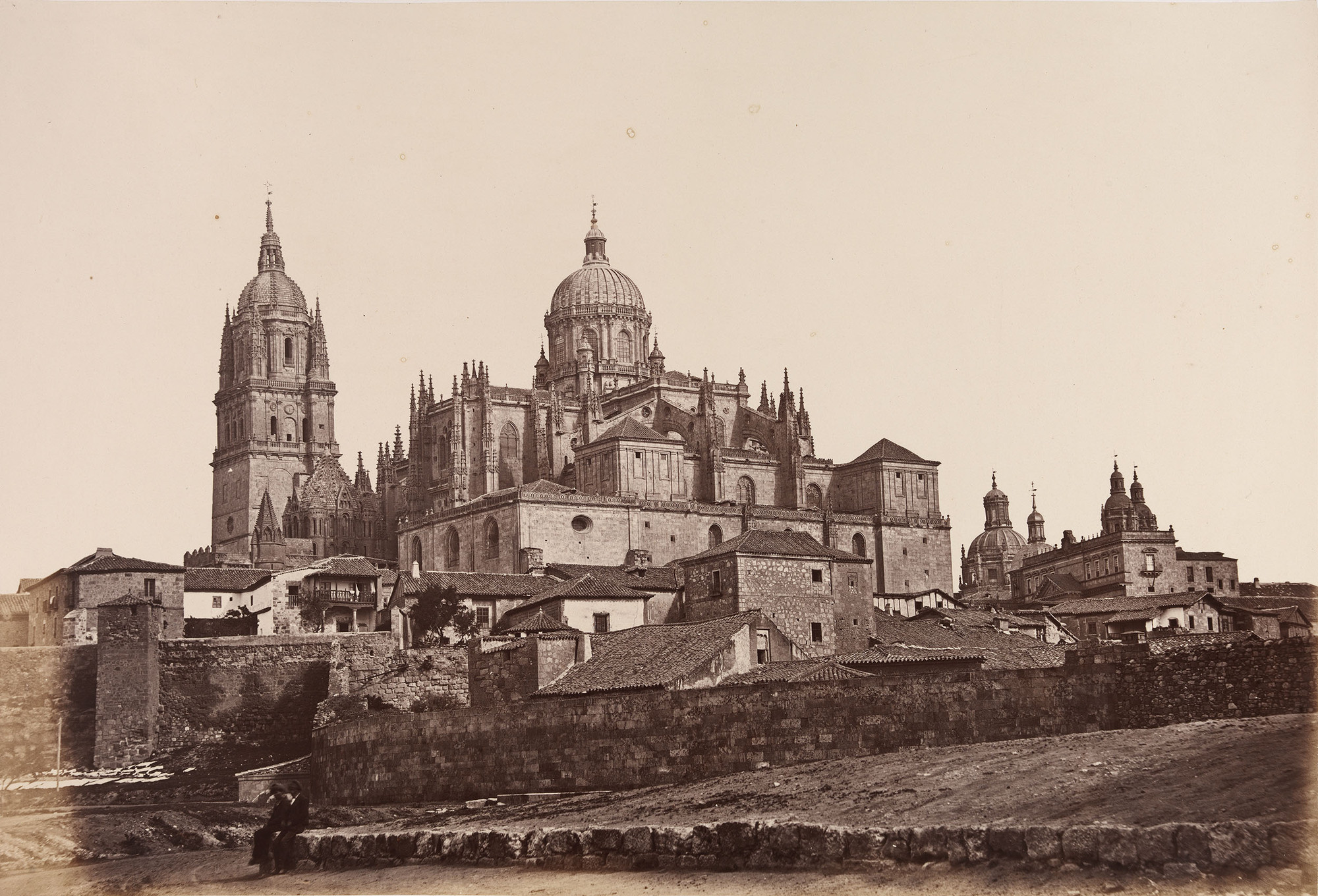 Photograph of the New Cathedral of Salamanca, Spain. The main features of the Cathedral are the two Gothic towers that dominate the skyline. Around the base of the Cathedral are domestic buildings. A small group of people are seated on a wall in the left of the foreground.