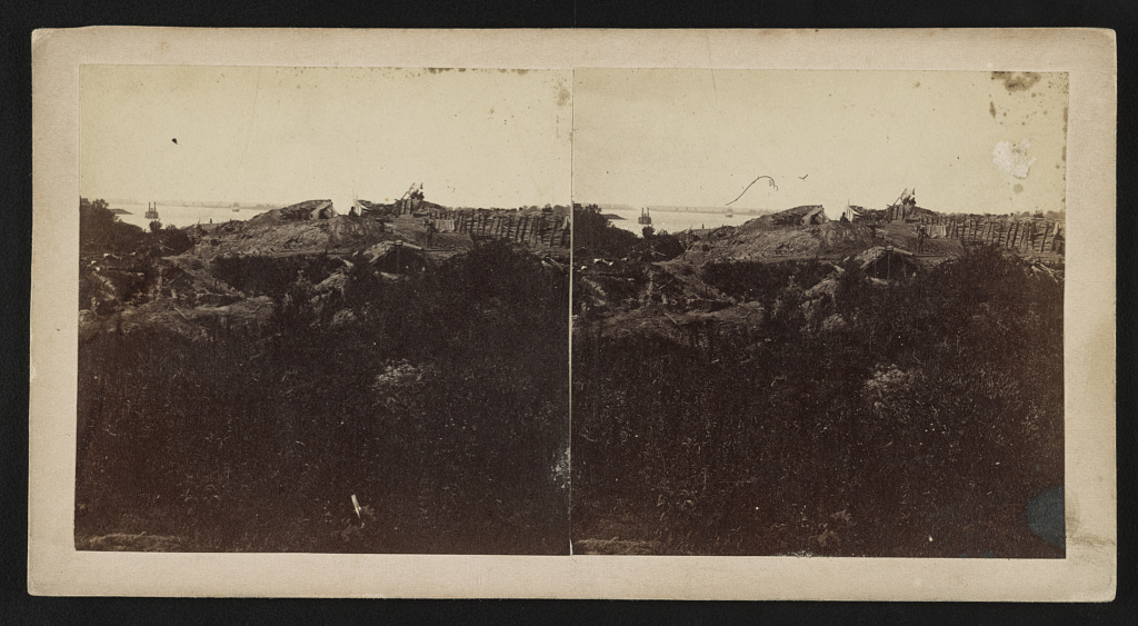 Photograph shows damaged weapons, fortifications and a view of the river from the parapet inside Port Hudson after the siege.