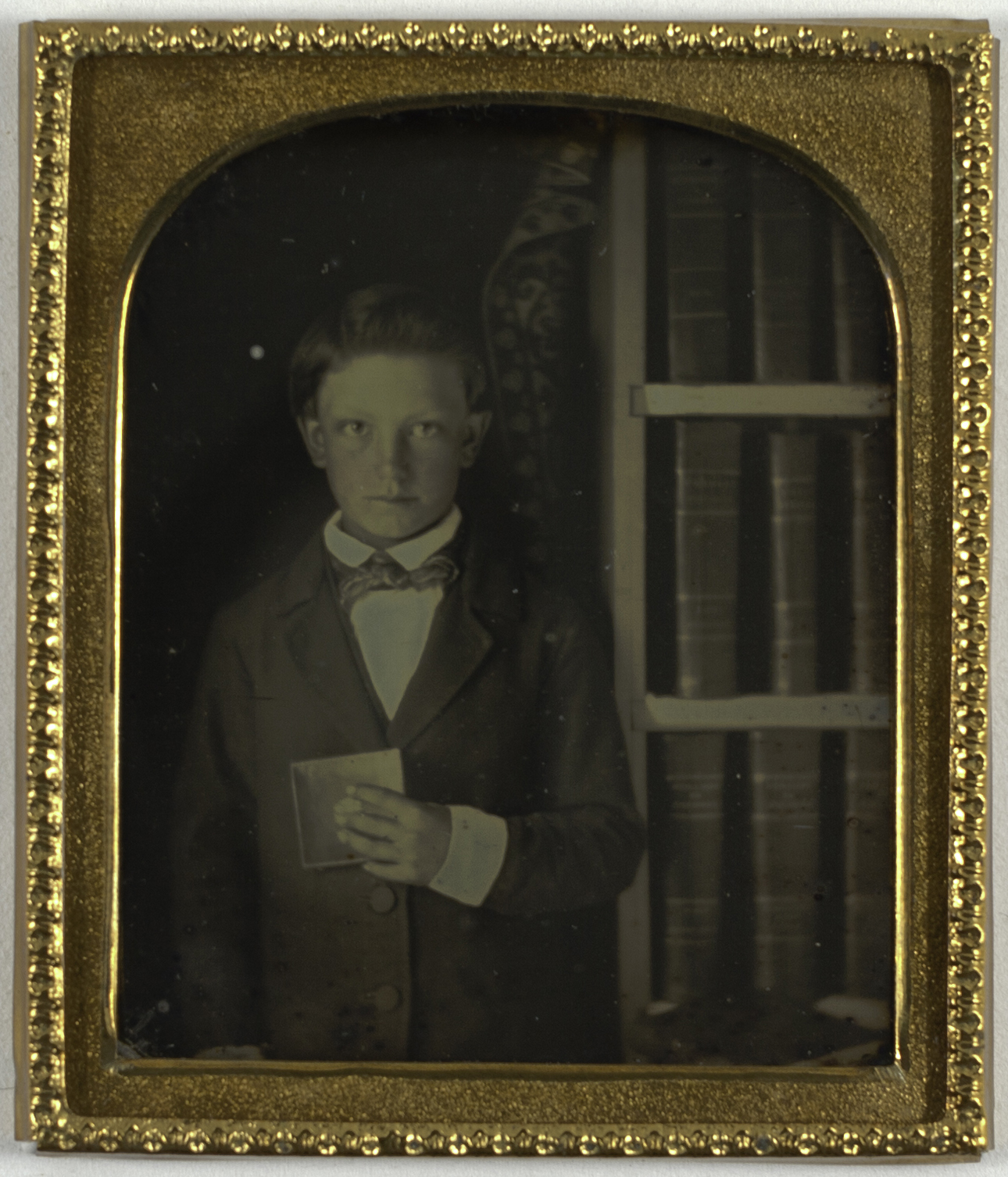 The boy in this picture clutches a cased image to his chest, as if to illustrate his affection for the subject depicted within. Daguerreotypes were a novel form of handheld picture, portable enough to slip into a pocket or palm. Portraits exchanged between friends and family could be kept close, a practice often mimed by sitters, who would pose for one daguerreotype while holding another.