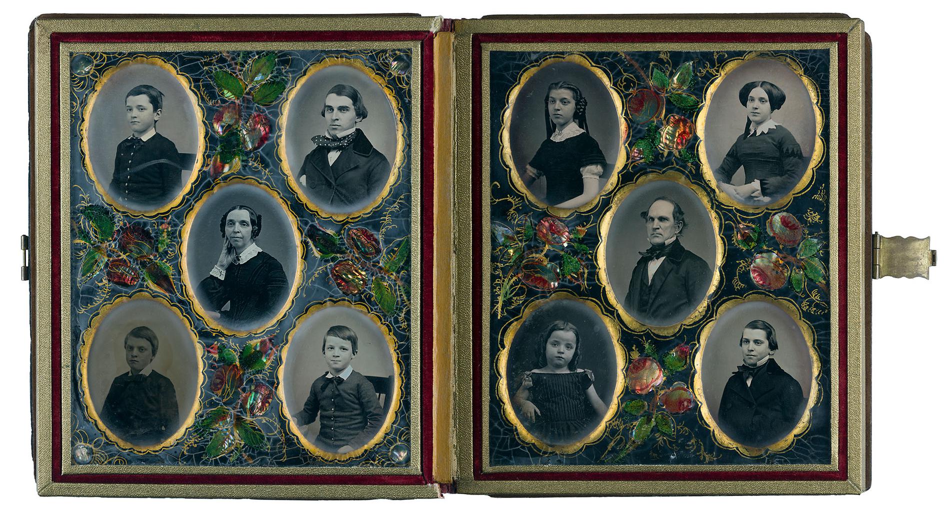 Daguerreotypes (9) and ambrotype (1), in papier mâché case, with hand-painted mats and mother-of-pearl inlay