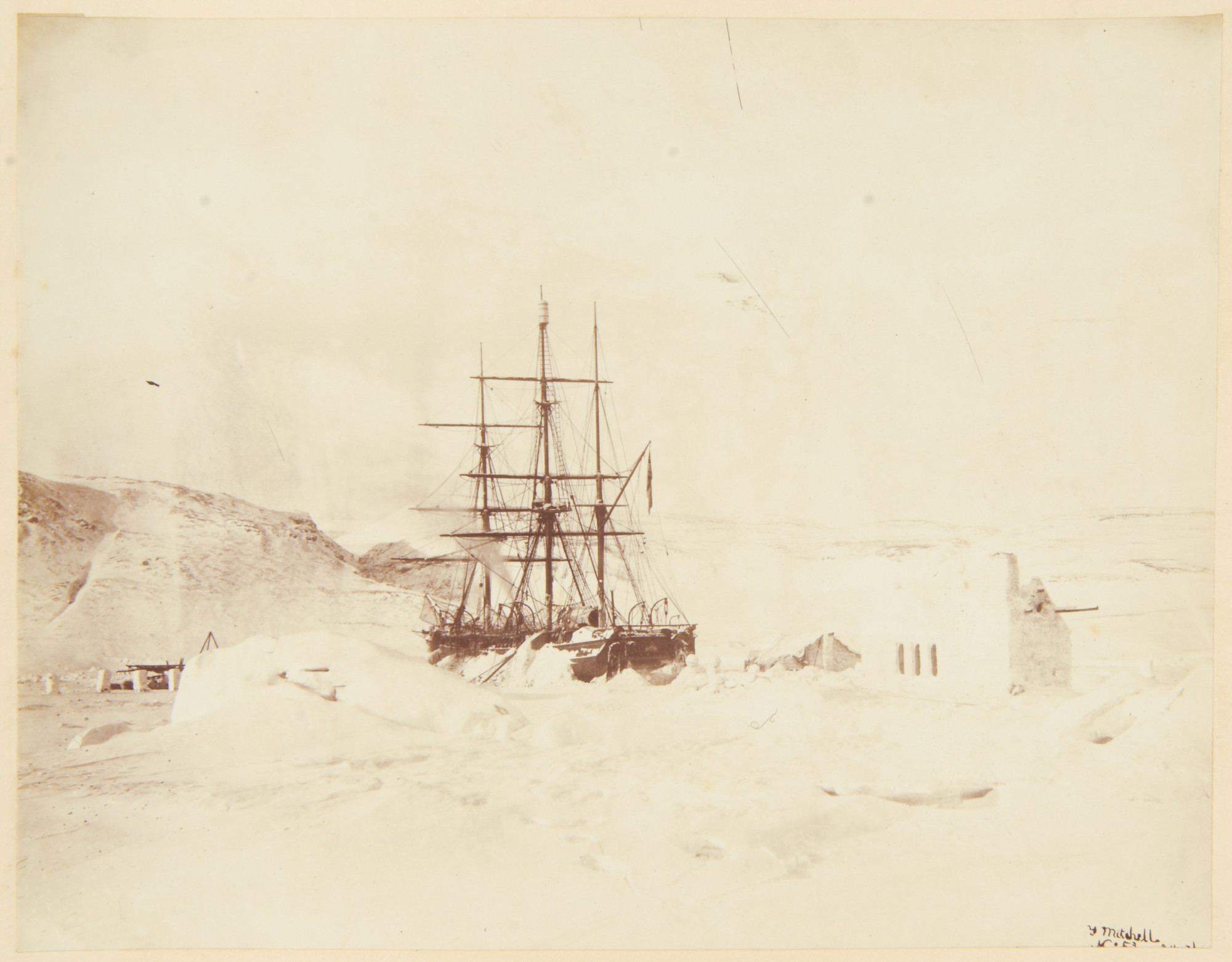 Photograph of stern and port side of HMS Discovery in the ice, huts to right