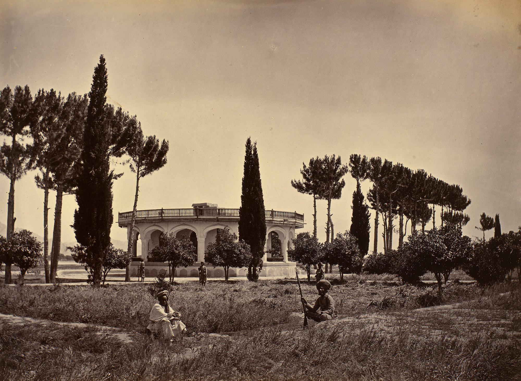 Photograph of a garden in Jalalabad. There is a pavilion with a veranda formed of a series of arches at the centre of the garden. There are trees surrounding it and mountains can just be seen in the distance. Soldiers wearing turbans and carrying guns are spaced across the grass in the foreground. A man wearing loose robes and a turban is sitting on the grass to the left. The photographer John Burke travelled with the Peshawar Valley Field Force during the Second Anglo-Afghan War (1878-80), one of a series of conflicts between Britain and Russia over control of Afghanistan. His images from the war capture landscapes, key strategic sites and people involved in the conflict.