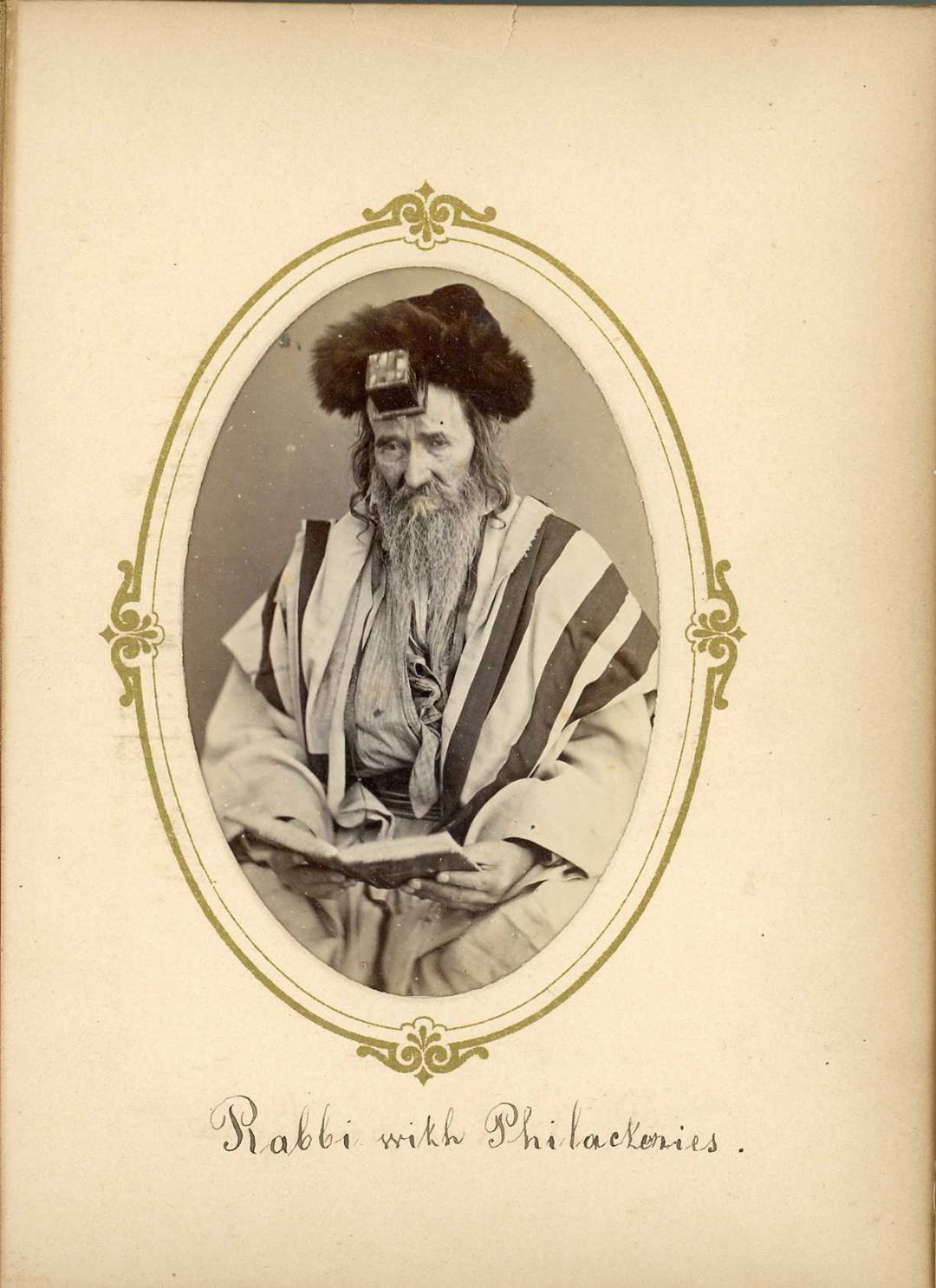 [A rabbi wearing tefillin, a leather box containing torah verses worn when praying]