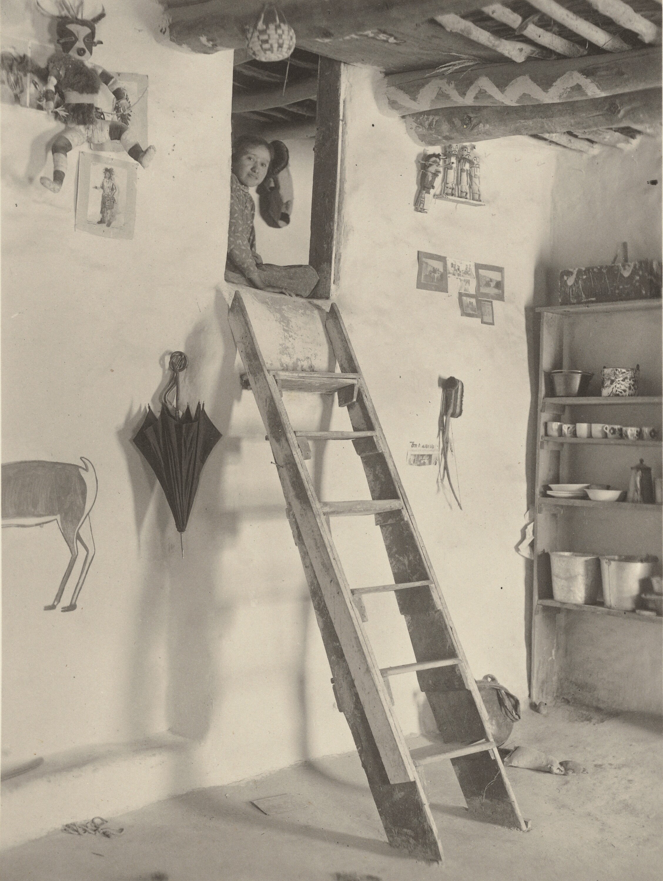 The Mr. Hooker of the title was the elected head of the Hopi village of Sichimovi in Arizona, a frequent setting for Adam Clark Vroman's portraits and genre studies. This interior view shows a woman seated in the upstairs sleeping quarters, peering out at the visitor with a camera. Among the objects in the living area below are traditional Hopi kachina dolls as well as a Victorian umbrella. The photographs tacked to the wall appear to be of a village and may be Vroman's work, possibly indicating a relationship between Vroman and this household.