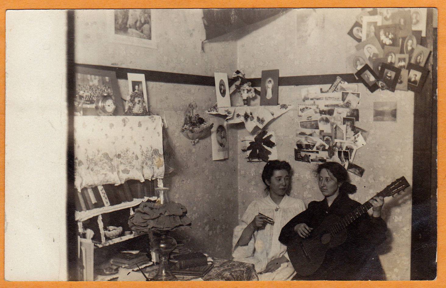Two ladies one with a harmonica and the other with a guitar in a dorm room (?)