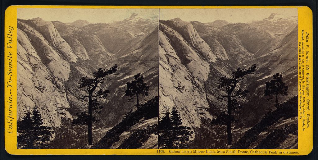 CaƱon above Mirror Lake, from South Dome, Cathedral Peak in distance