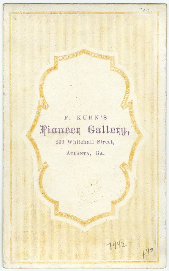 Backmark for F. Kuhn's Pioneer Gallery, 290 Whitehall Street, Atlanta