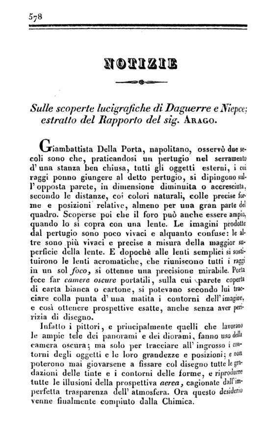 1839, June (or soon after) Page "Sulla scoperte lucigrafiche di Daguerre e Niepce; estratto del Rapporto del sig. Arago" in Il Politecnico. Repertorio mensile di studj applicati alla prosperità e coltura sociale, vol. 1, anno primo, semestre primo, p. 578