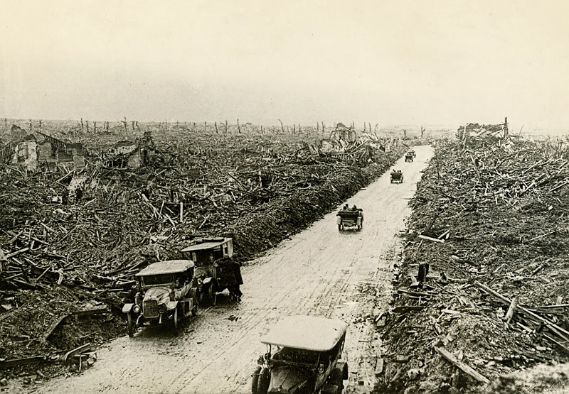A road has been cleared through an area that has seen years of heavy bombardment.