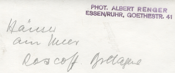 "Phot. Albert Renger Essen/Ruhr, Goethestr. 41" stamp on verso, and pencil inscription "Hõuser am Meer Roscoff Bretagne." Agfa Brovica paper.