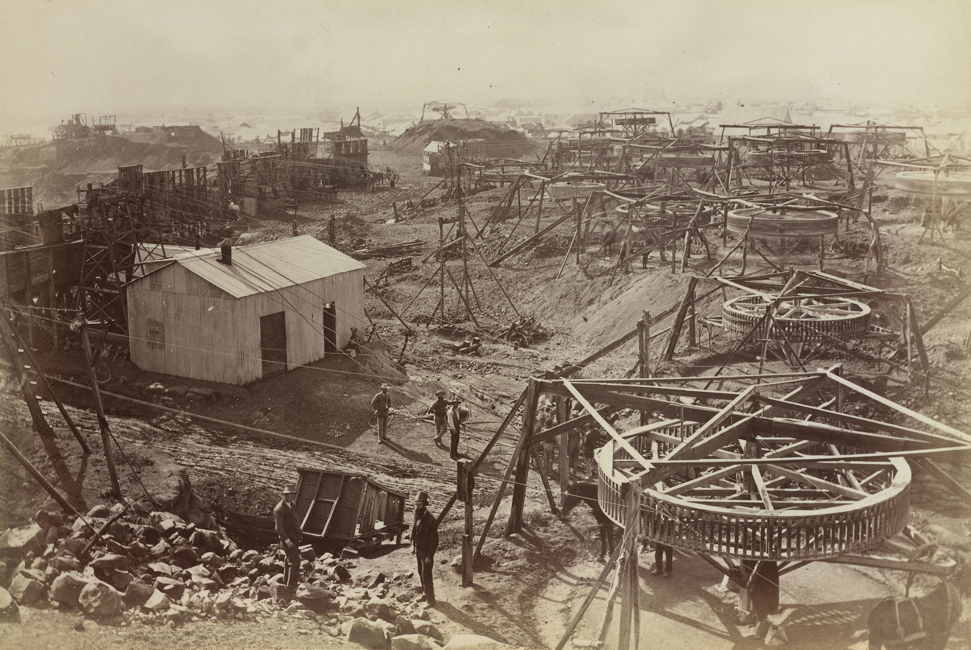 Photograph of the machinery used to hoist and wash diamond soil at a mine in Griqualand-West. To the left there are wooden hoists lining the edge of the pit. To the right there are large wooden wheels supported by frames, which are pulling up the cables from the hoists. There is a hut and a number of workers in the space between the two sets of machinery. Griqualand-West was a British colony in southern Africa. The discovery of diamonds in the area led to vast excavation sites and the mass immigration of workers.