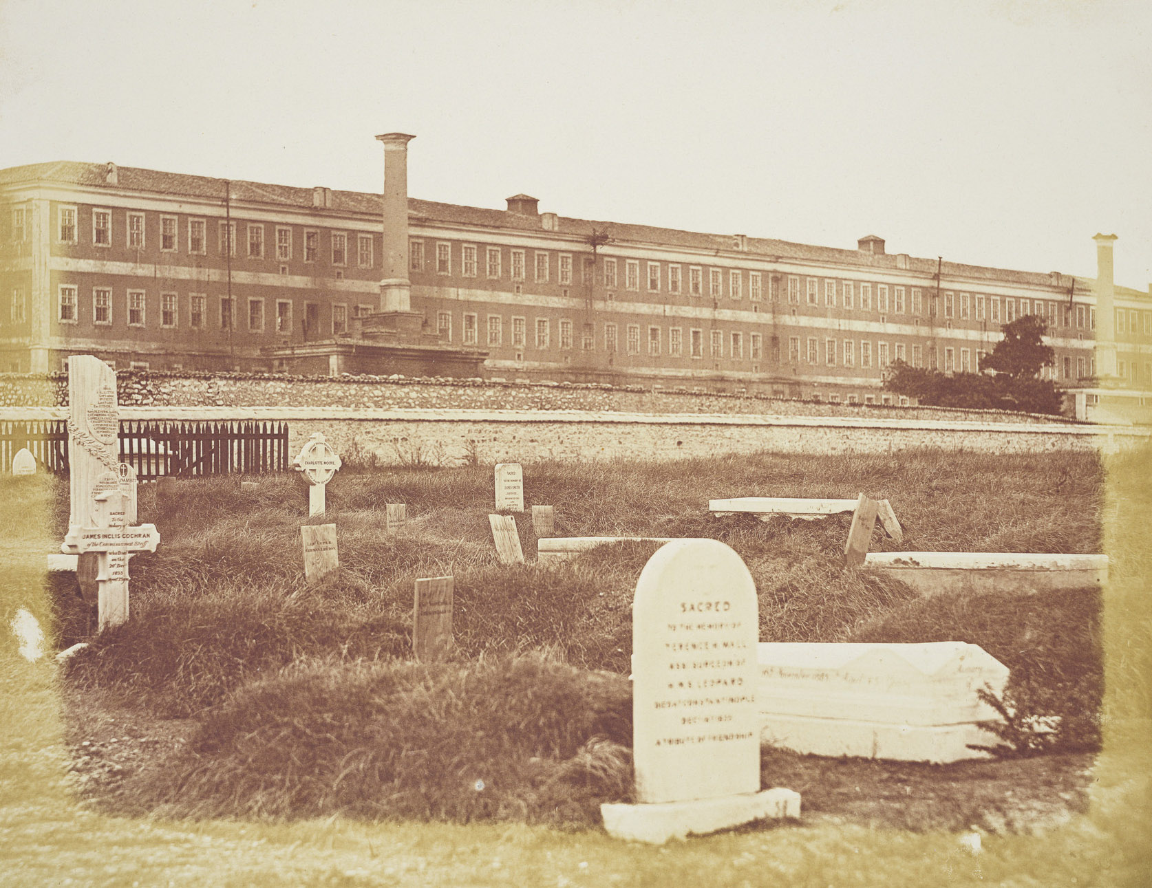 Photograph of the Haydarpasa cemetery near the Scutari hospital complex in Constantinople. In the grassy area in the foreground there are a number of small stone headstones, most with the inscription clearly visible. Behind is a long, two storey barrack building with two large columns in front. Several military hospitals were established by the British in the Scutari area of the city during the Crimean War. The Haydarpasa cemetery was built nearby to bury the thousands of men who died in the hospitals during the course of the war.