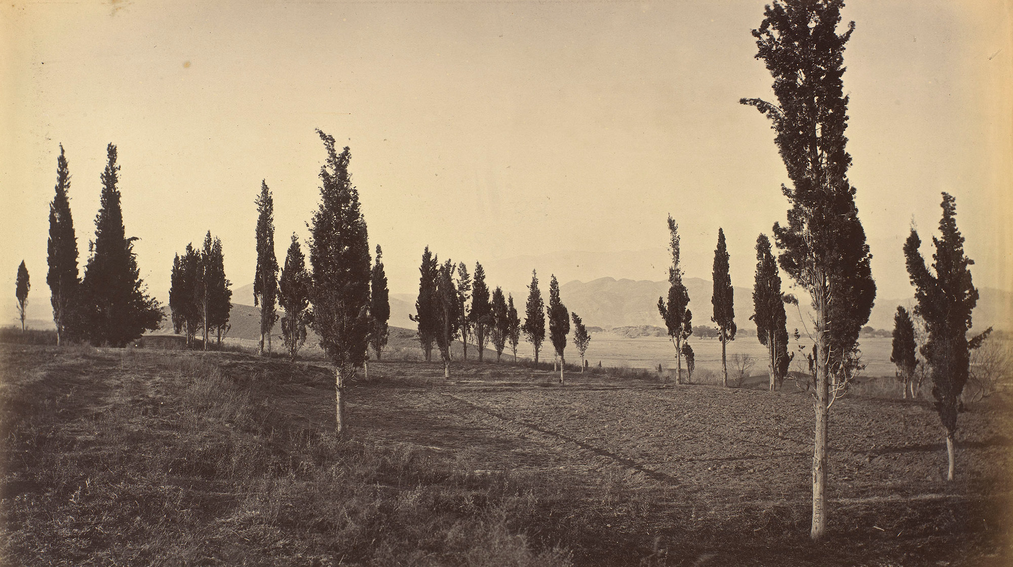 Photograph of a garden near Jalalabad. In the foreground there is a grassy plain with trees spread across it. Mountains extend into the distance behind. The photographer John Burke travelled with the Peshawar Valley Field Force during the Second Anglo-Afghan War (1878-80), one of a series of conflicts between Britain and Russia over control of Afghanistan. His images from the war capture landscapes, key strategic sites and people involved in the conflict.