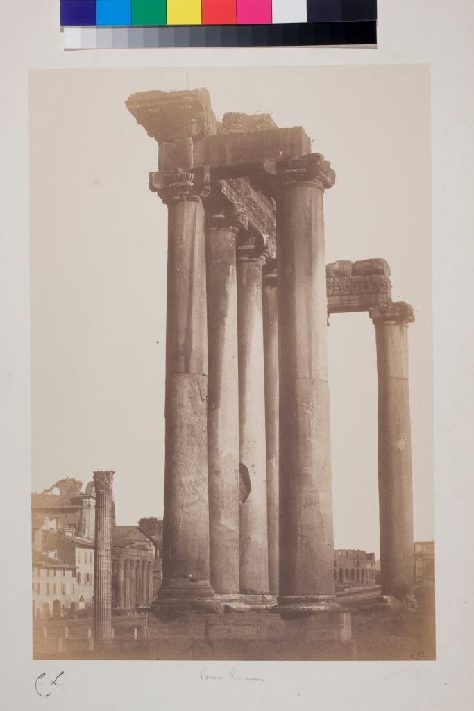 View of the eight Columns at the foot of the Capitol, in extreme profile, including a portion of the Basilica of Constantine, Phoca's Column, and the Arch of Titus