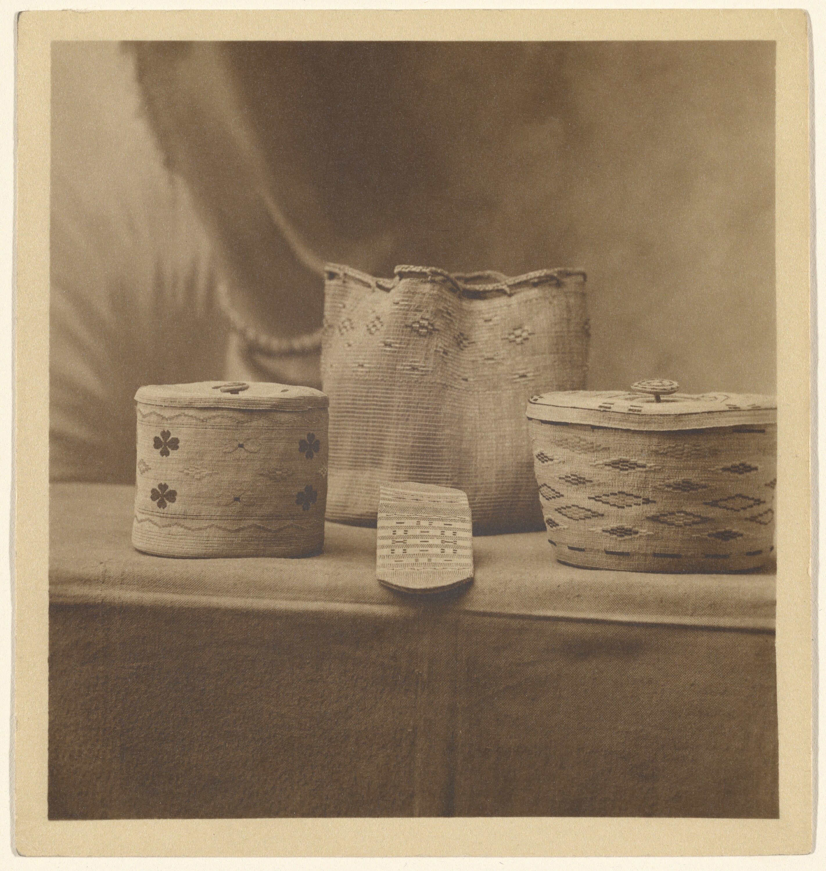 Against a draped background with a soft yet spiky shadow, Adam Clark Vroman artfully arranged three patterned baskets and an unidentifiable woven item on a table. His interest in documenting the Pueblo Indians clearly extended beyond making straightforward portraits to include the artifacts they created. In addition to photographing such objects, he displayed the baskets he had collected from various Pueblo tribes in his Pasadena apartment, along his with numerous Navaho weavings.