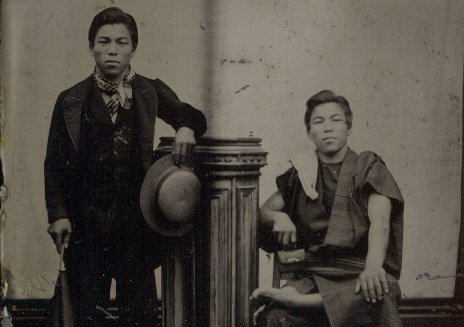East and West - Japan. A Japanese man dressed first in Western and then in Japanese costume, with a dark "separation line" between the two exposures running down center of image