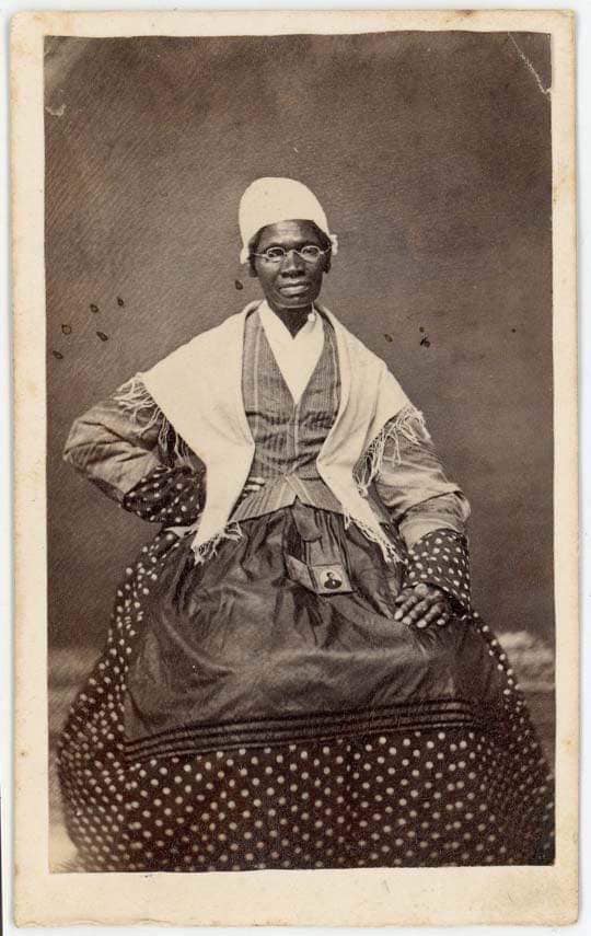 Sojourner Truth holding a photograph of her grandson James Caldwell on her dress