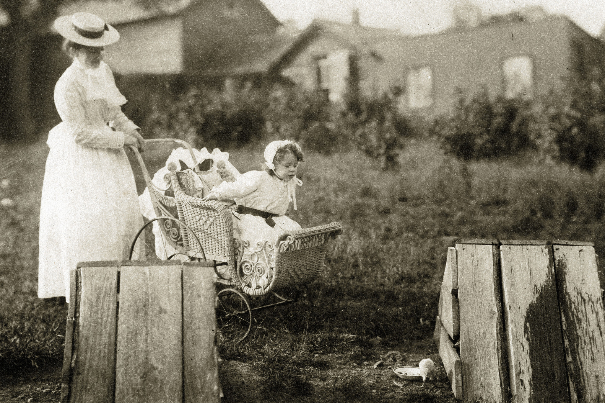 Notes: Katherine Kitty Stieglitz was the only child of Alfred Stieglitz. Born September 27, 1898, she soon became the subject of an early series of photographs making up a larger photographic record he called his Photographic Journal of a Baby. This hand-pulled photogravure of Kitty, originally taken in 1900, was used as the frontis gravure for the January, 1902 issue of The Photographic Times. The photograph depicts Kitty in her pram (Stieglitz's first wife Emmeline is seen at left steadying it) leaning over to investigate a baby chicken feeding outside its' hutch. This is one of a series of photographs of Kitty to appear in this issue. There are an additional 18 images of her reproduced as halftones: three full-page plates showing a combined 17 images and one other additional full-page image.