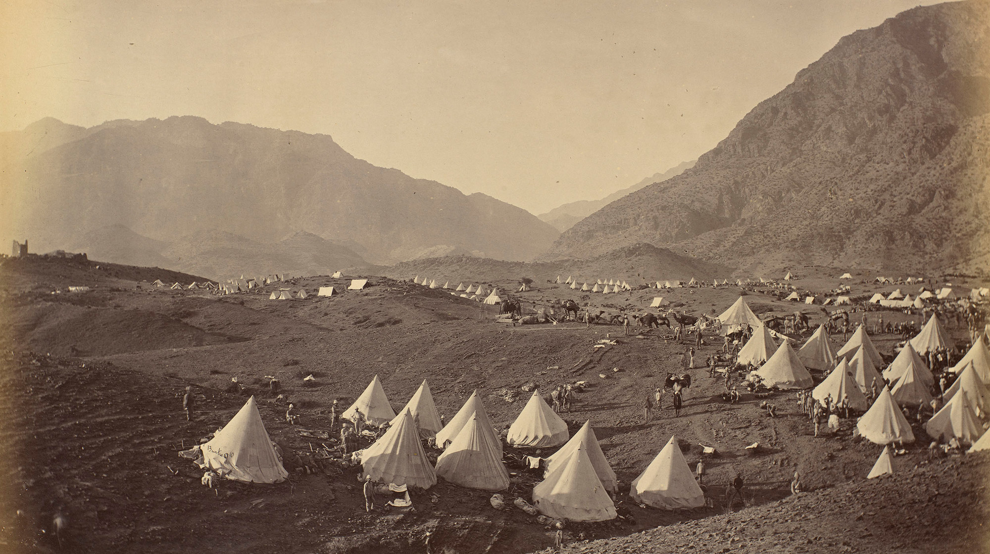Photograph of a military camp on Shagai Heights, a plateau at the edge of the Khyber Pass. In the foreground there is a small group of tents with kit piled outside and soldiers standing and sitting in small groups around them. More tents are spread over an area of open land behind with a group of camels at the centre. The Fort of Ali Masjid is in the distance to the far left. There are mountains behind. The photographer John Burke travelled with the Peshawar Valley Field Force during the Second Anglo-Afghan War (1878-80), one of a series of conflicts between Britain and Russia over control of Afghanistan. His images from the war capture landscapes, key strategic sites and soldiers involved in the conflict.