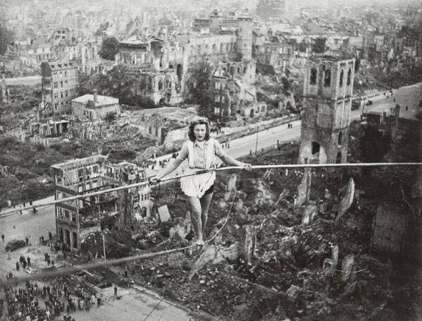 [A high-wire artist above the ruins of Heumarkt in Cologne, Germany]